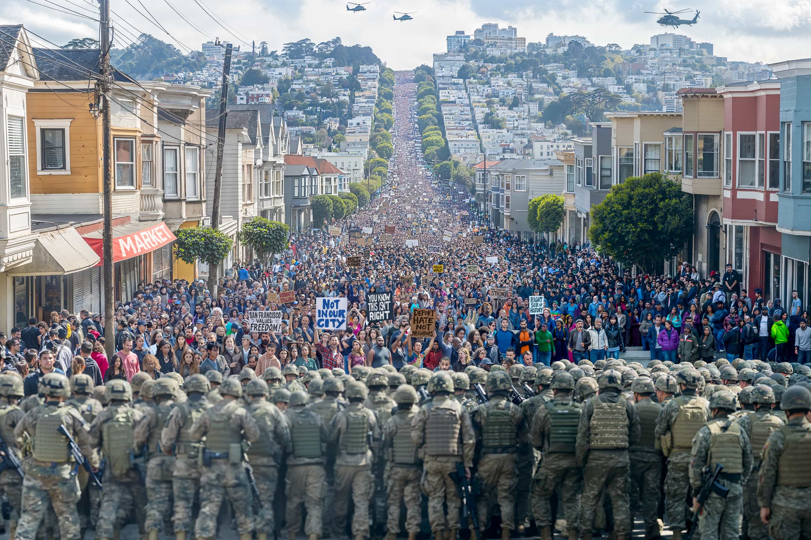 Told through 15 immersive, photojournalistic scenes set in San Francisco, the project captures both large-scale confrontations and intimate human moments under military occupation. These images ground abstract political concepts in emotional reality, making tangible what might otherwise remain theoretical. The narrative explores how diverse communities respond when facing extraordinary challenges to civil liberties, weaving together stories of institutional failure, community resilience, and individual courage.